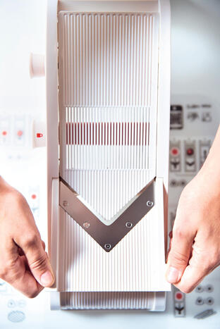 The non-skid feet on the mandoline kitchen tool keep it steady, while the specially-designed food guide protects your hands.